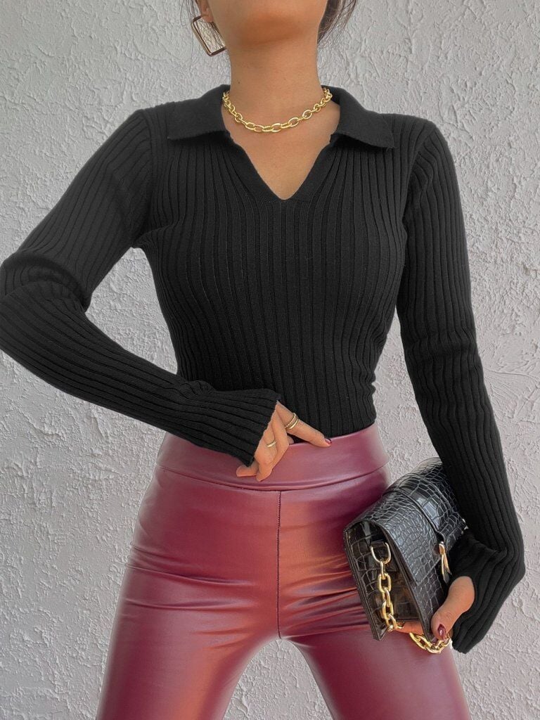 Kadın Siyah Polo Yaka Parmak Detay Triko Bluz 2047